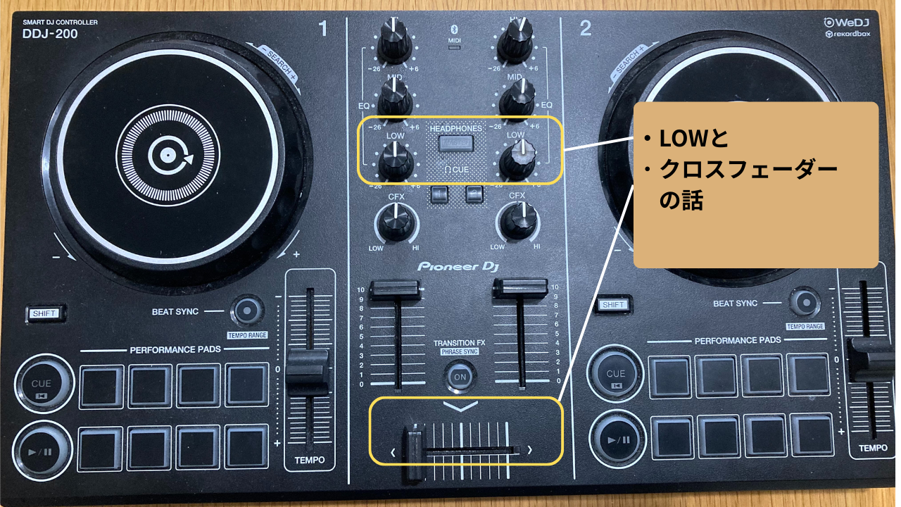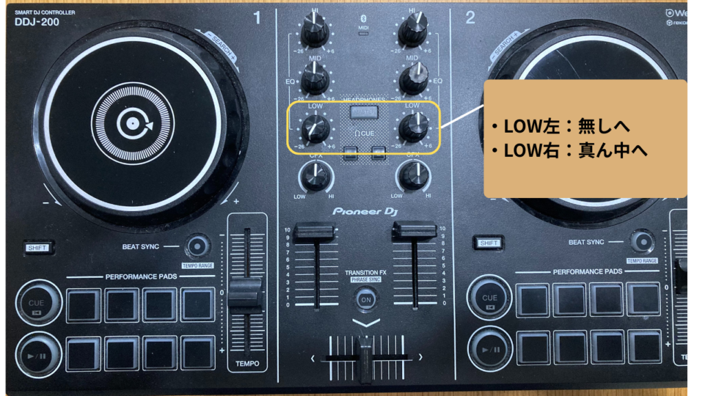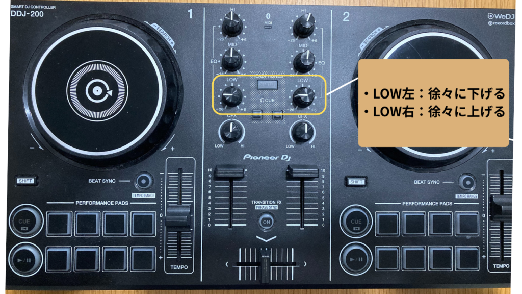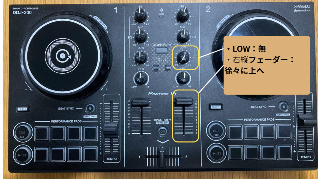 ※つまみはLOW以外にもHI,MID,CFXがあり、ここもLOWと合わせてフェードイン・フェードアウトに使うとより効果的です。ですが始めはLOWだけに集中して行い、慣れたらそちらもLOW同様徐々に上げ下げをして繋げます。