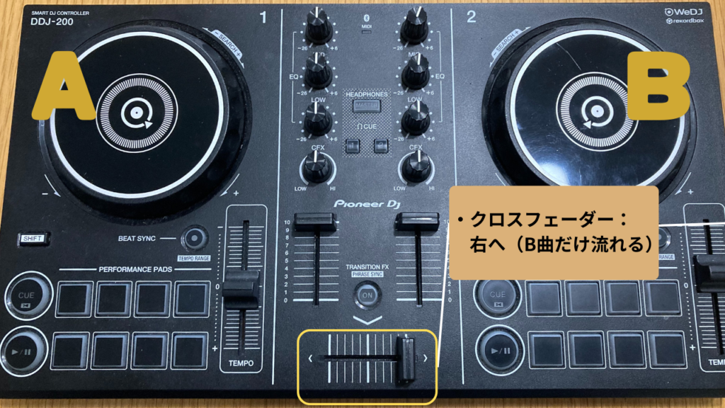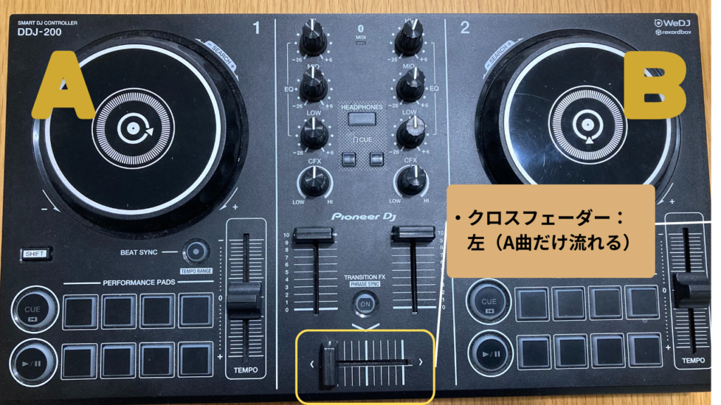 - DJ機材には「クロスフェーダー」という横に動かすツマミがあります。これを左に寄せればAの曲だけが、右に寄せればBの曲だけが鳴る仕組みです。真ん中にすれば両方音が鳴ります。