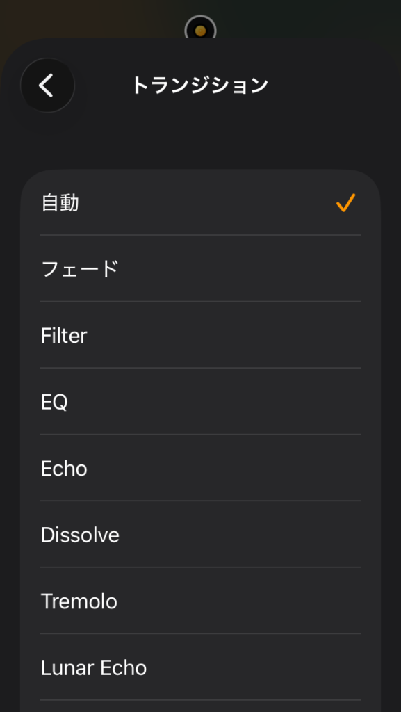 以下からミックスのつなぎ方を細かく設定できます。今回お話ししている自分のタイミングでミックスする場合についてはトランジションが参考になります。次の曲にミックスボタンを押したとき、どんなエフェクトをかけながらつないでくれるかを選べます。
