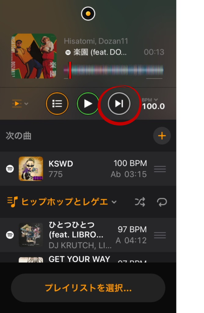 完全な自動再生も便利ですが、より自然で「DJらしい」ミックスにするためのコツがあります。 オートミックス再生中、画面には現在かかっている曲と次に再生される曲が表示されます。曲が自動で切り替わるのを待つのではなく、次の曲に移りたい自分のタイミングで「次の曲へミックス(赤丸印)」ボタンを押してみましょう!
