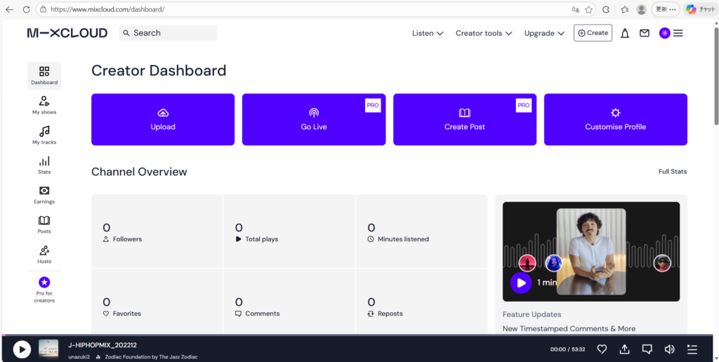 mixcloudの登録、リスナー画面・クリエイター画面の説明、アップロード方法を説明します