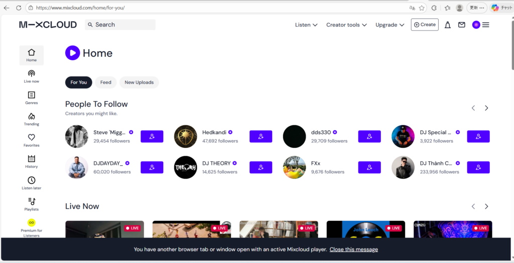 世界中のDJの最新MIXや話題の番組がずらりと並び視聴ができます。ジャンル別おすすめやフォロー中クリエイターの新作が次々流れてきて、まるで音楽フェスを歩いている感覚。流し聴きでも、新しい音との出会いが自然に生まれるのが最高です。