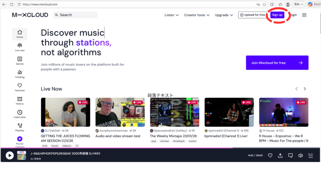 まずはmixcloudにアカウント登録(無料)→Sign upへ