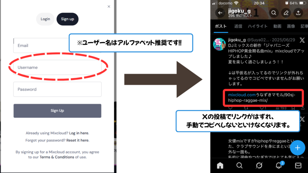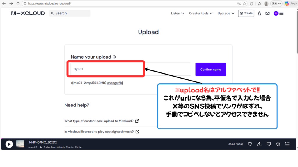 アカウント登録時と同様に平仮名・カタカナで作成すると、mix公開したURLがそのままで作成され、せっかくがんばってmixを作成・公開し、SNSで「聴いて下さい!!」と呼びかけてもX等SNSではリンクが外れてしまい、手動でコピペしないとアクセスできない状態になります。